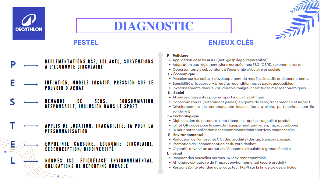 Je suis capable d’intégrer les enjeux sociaux et écologiques dans l’analyse de l’environnement (diagnostic PESTEL – niveau 2) ; cela m’a permis d’élargir la perspective stratégique de l’entreprise, d’anticiper les risques RSE et de formuler des recommandations responsables et durables.