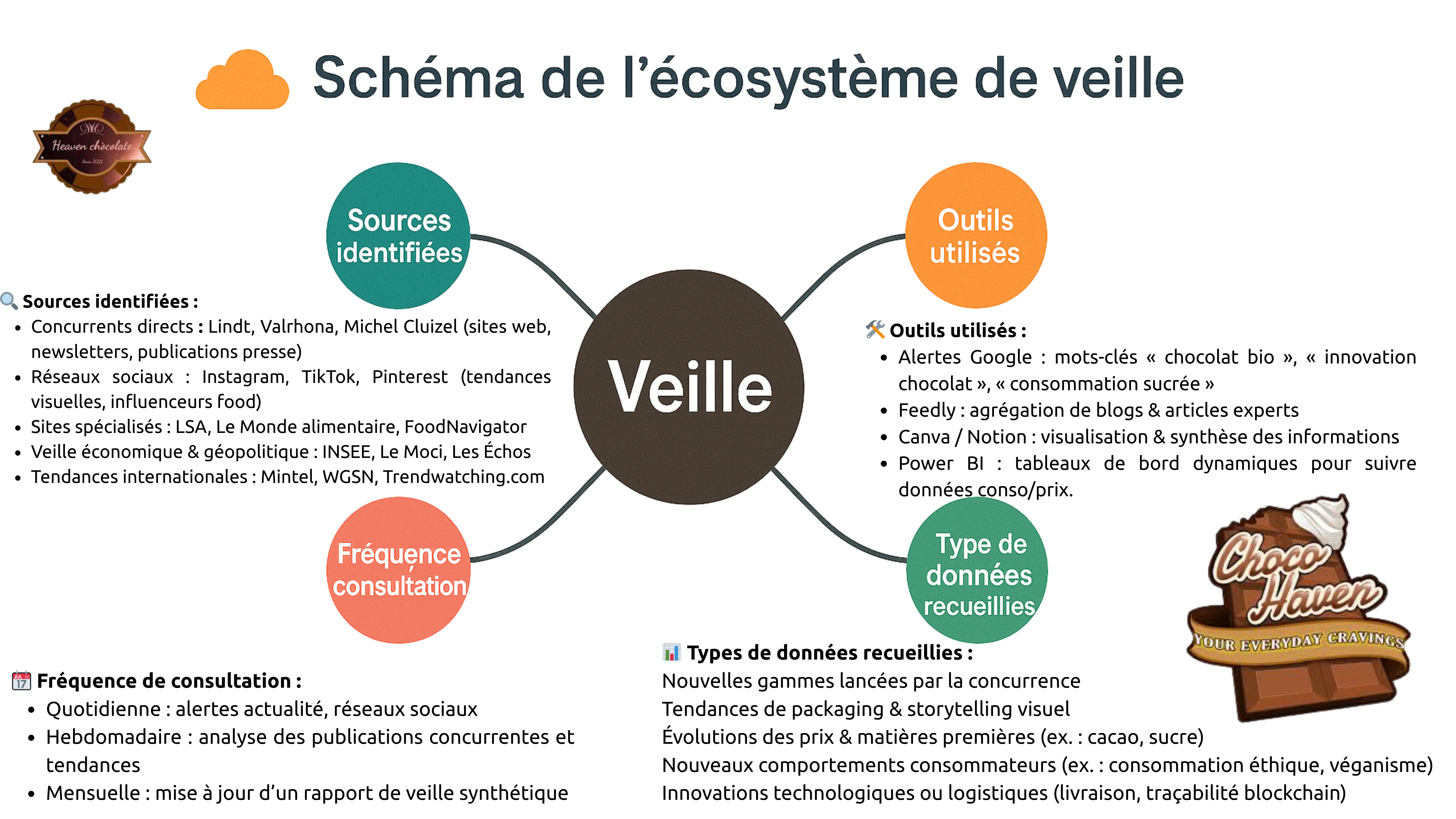 Je suis capable de mettre en place une veille stratégique efficace en utilisant des outils comme des alertes automatisées et de la datavisualisation ; pour Heaven Chocolate, cela permet de suivre en temps réel les tendances du marché, la concurrence et les attentes consommateurs, afin d’anticiper les évolutions et ajuster la stratégie marketing. »